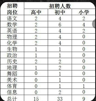 現(xiàn)面向全國(guó)招聘小學(xué)和初高中各學(xué)科優(yōu)秀教師,招聘計(jì)劃見(jiàn)下表: