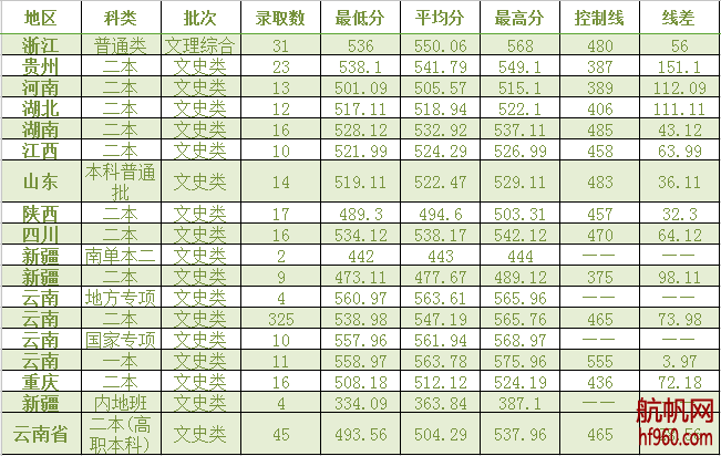 西南林業(yè)大學(xué)2017年全國(guó)各省份文史類錄取情況表