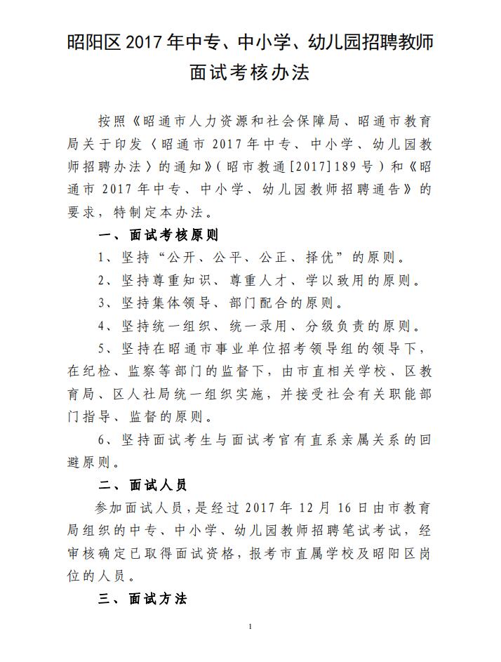 昭陽區(qū)2017年中專、中小學(xué)、幼兒園招聘教師面試考核辦法