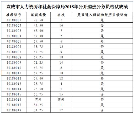 根據(jù)《中共宣威市委辦公室 宣威市人民政府辦公室關(guān)于印發(fā)〈宣威市市直機(jī)關(guān)公開遴選公務(wù)員實(shí)施辦法(試行)〉的通知》(宣辦發(fā)〔2017〕114號(hào))規(guī)定,按照《宣威市人力資源和社會(huì)保障局2018年公開遴選公務(wù)員公告》的程序安排,本次遴選筆試工作現(xiàn)已結(jié)束,現(xiàn)將筆試成績(jī)公告如下: