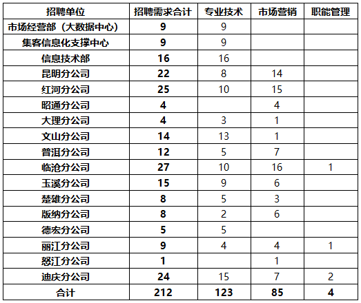 提醒:根據(jù)以往報(bào)名數(shù)據(jù),昆明地區(qū)報(bào)名人員較多,競爭較激烈,而版納、普洱、臨滄、文山、迪慶分公司報(bào)名人員相對較少,建議根據(jù)自身情況、個(gè)人興趣以及發(fā)展意向選擇適合的職位作為應(yīng)聘志愿。