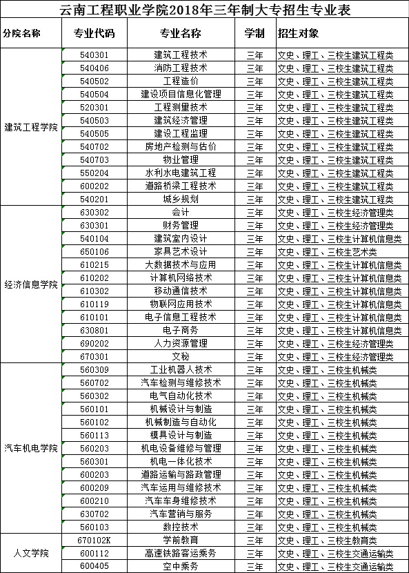 云南工程職業(yè)學(xué)院2018年招生章程