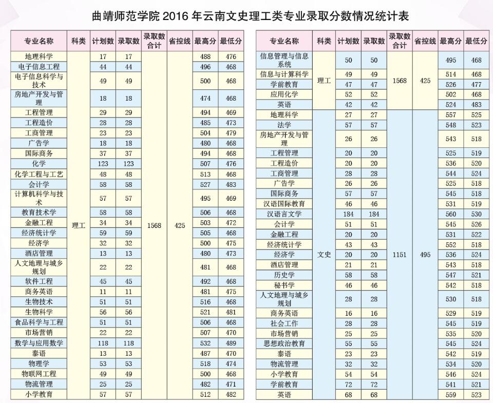 曲靖師范學(xué)院2016年云南文史理工類專業(yè)錄取分?jǐn)?shù)情況統(tǒng)計表