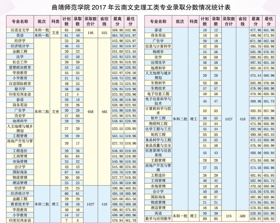 曲靖師范學院2017年云南文史理工類專業(yè)錄取分數(shù)情況統(tǒng)計表