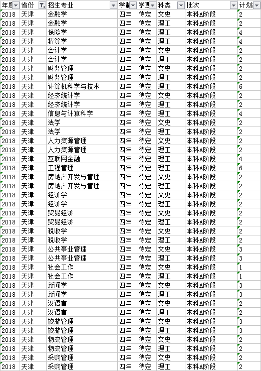 云南財經(jīng)大學(xué)2018年本科分省招生計劃表(天津)