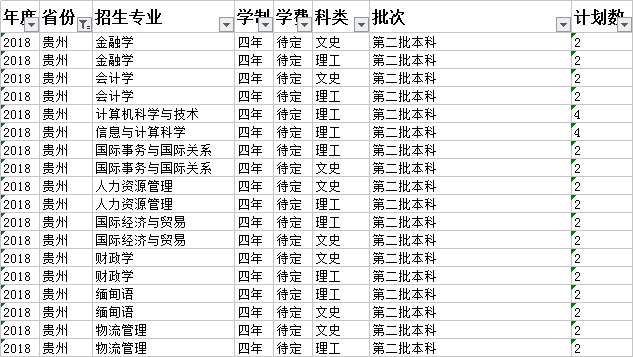 云南財(cái)經(jīng)大學(xué)2018年本科分省招生計(jì)劃表(貴州)