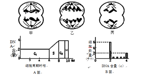 27.如圖8所示,甲、乙、丙是某個(gè)二倍體動(dòng)物的幾個(gè)細(xì)胞分裂示意圖(數(shù)字代表染色體,字母代表染色體上帶有的基因),A圖表示一個(gè)細(xì)胞周期中的細(xì)胞核內(nèi)DNA含量的變化曲線;B圖表示處于一個(gè)細(xì)胞周期中各個(gè)時(shí)期細(xì)胞數(shù)目變化(用特殊方法在一個(gè)培養(yǎng)基中測得的),請據(jù)圖回答(1)~(4)。
