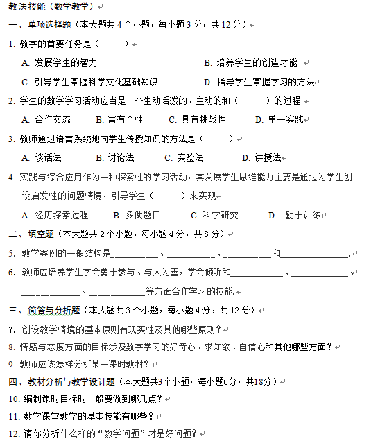考試形式:閉卷,筆試。“專業(yè)知識(shí)”滿分100分,考試用時(shí)100分鐘;“教法技能”滿分50分,考試用時(shí)50分鐘。二者合卷滿分共150分,考試限定用時(shí)150分鐘。