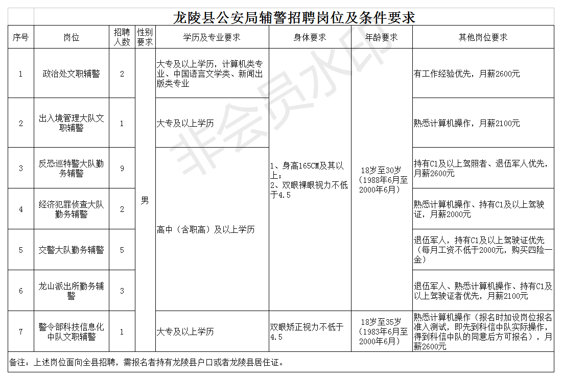 共招聘輔警23名,其中:政治處2名;反恐巡特警大隊9名;出入境管理大隊1名;經(jīng)偵大隊2名;交警大隊5名;龍山派出所3名;警令部科技信息化中隊1名。(詳見附件)。