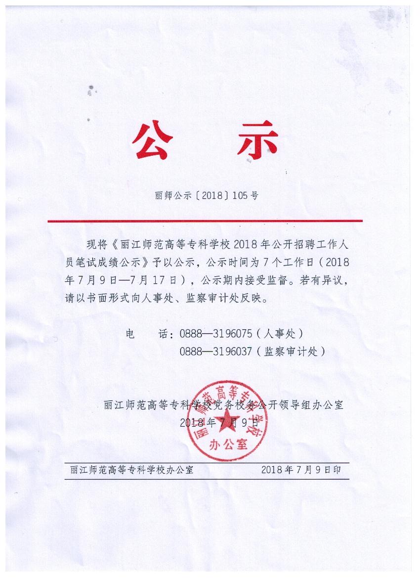 麗江師范高等專科學(xué)校2018年公開招聘工作人員筆試成績(jī)公示