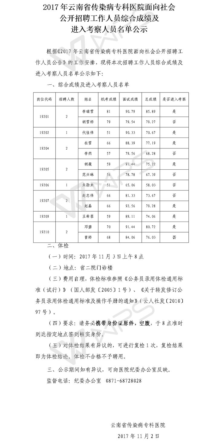 云南省傳染病專科醫(yī)院面向社會 公開招聘工作人員綜合成績及進入考察人員名單公示