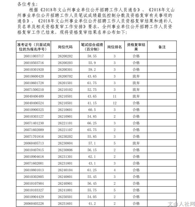 2018年文山州事業(yè)單位招聘工作人員資格復(fù)審結(jié)果