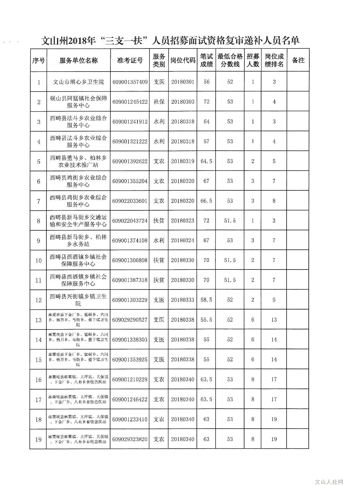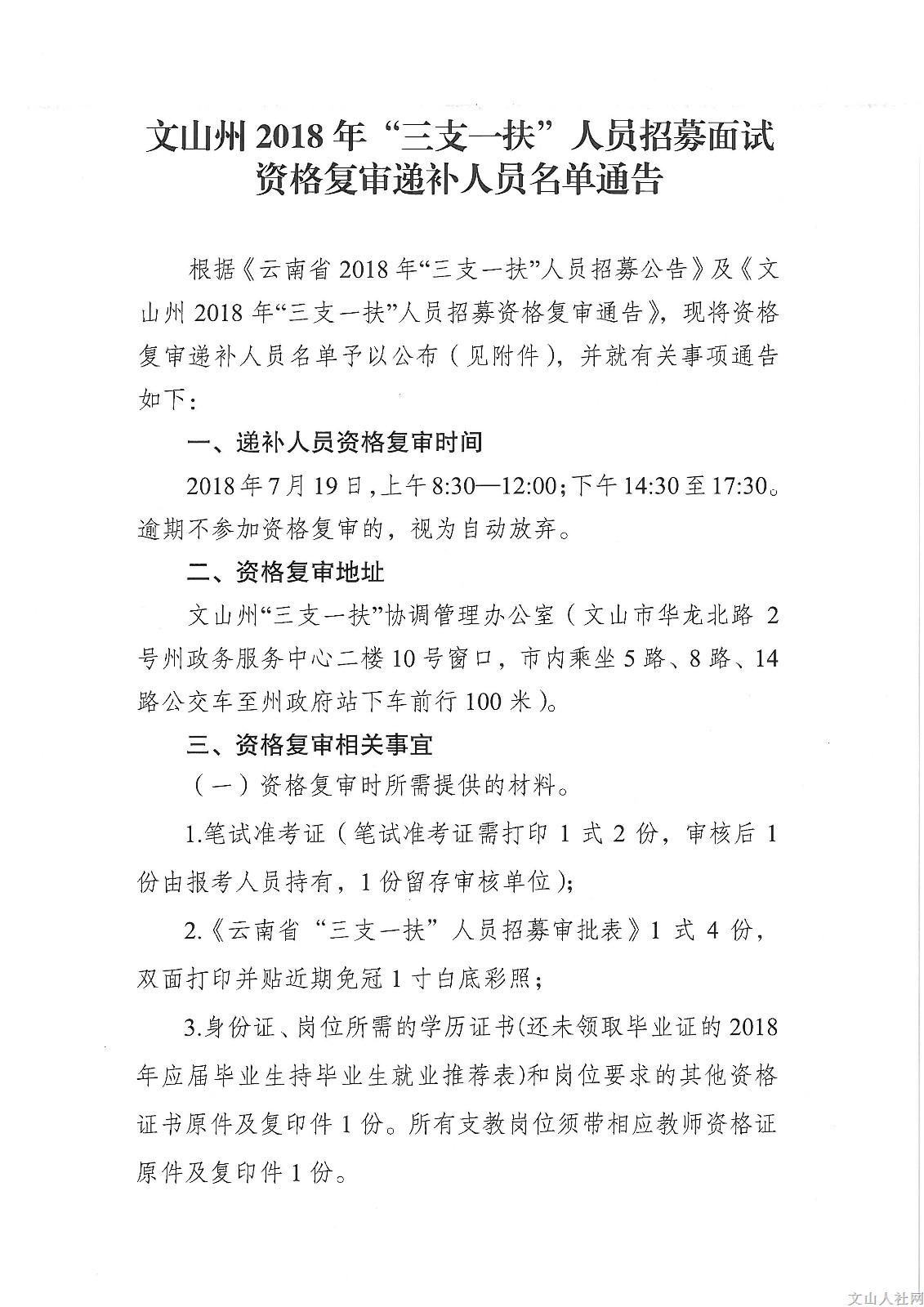 文山州2018年“三支一扶”人員招募面試資格復(fù)審遞補人員名單通告