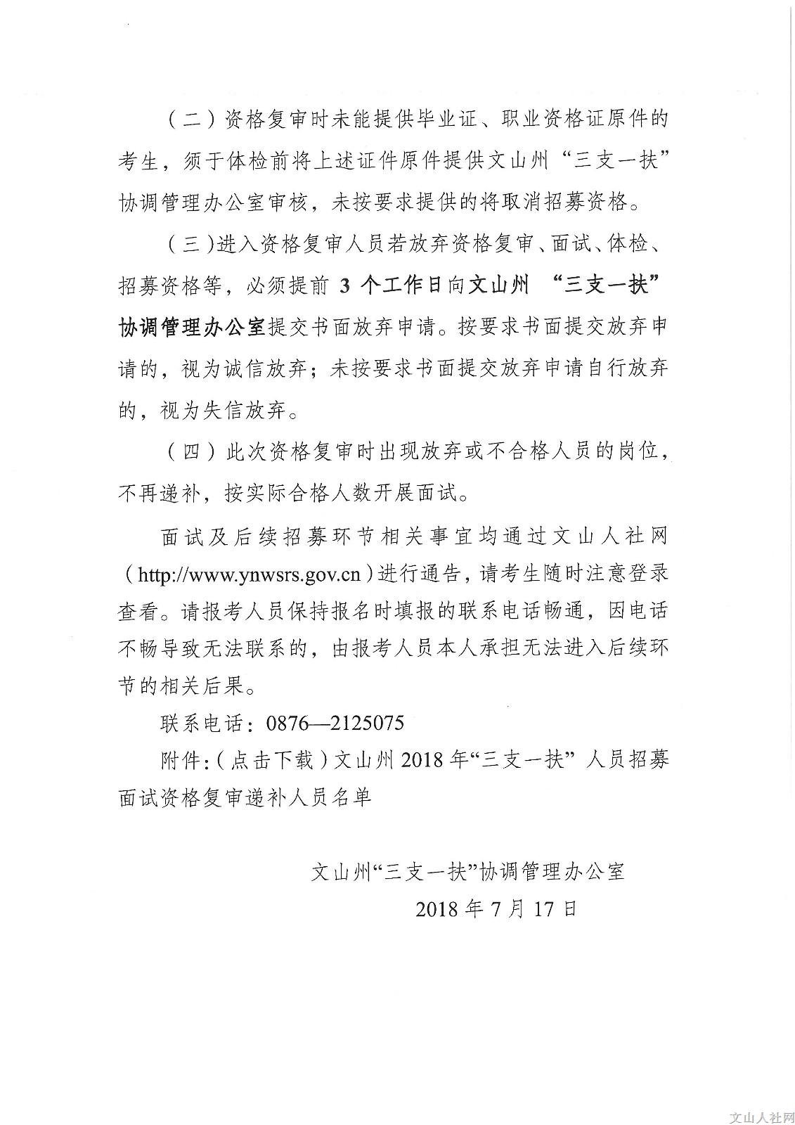 文山州2018年三支一扶招募面試資格復(fù)審遞補名單通告