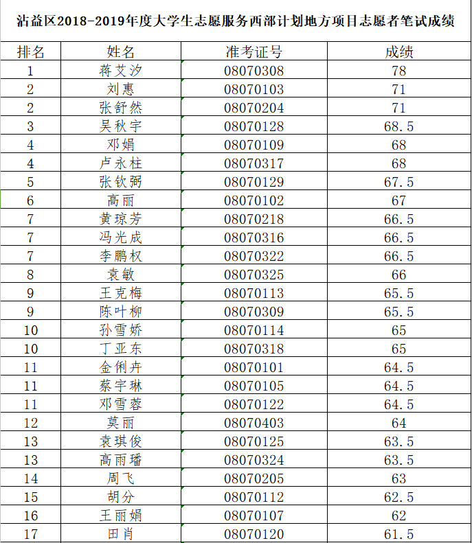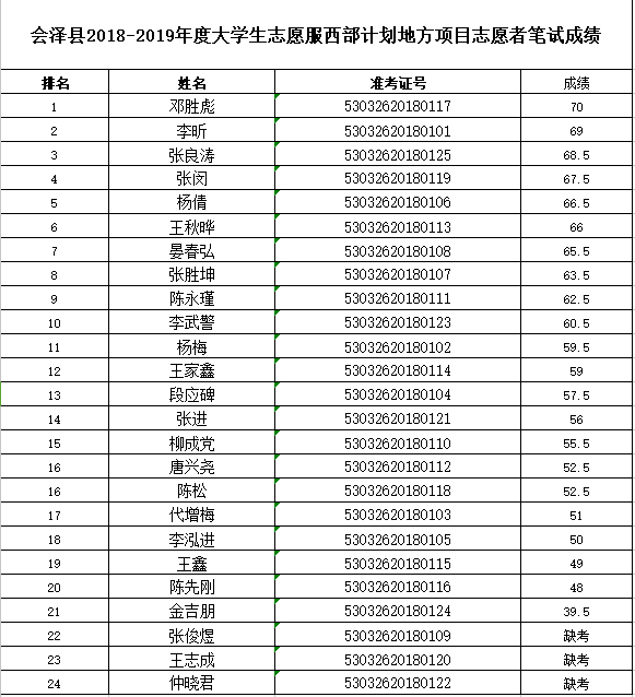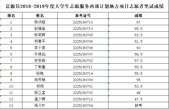曲靖市2018—2019年度大學(xué)生志愿服務(wù)西部計劃省級地方項目招募名額為11名,其中:麒麟?yún)^(qū)1人,沾益區(qū)3人,師宗縣4人,富源縣1人,會澤縣2人。根據(jù)曲靖市2018-2019年度大學(xué)生志愿服務(wù)西部計劃省級地方項目志愿者招募程序,本次筆試報考人數(shù)為219人,應(yīng)試185人,缺考34人,現(xiàn)將筆試成績公告如下: