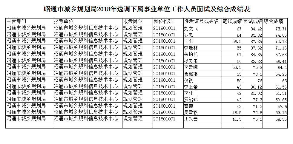昭通市城鄉(xiāng)規(guī)劃局2018年選調(diào)下屬事業(yè)單位人員面試及綜合成績表