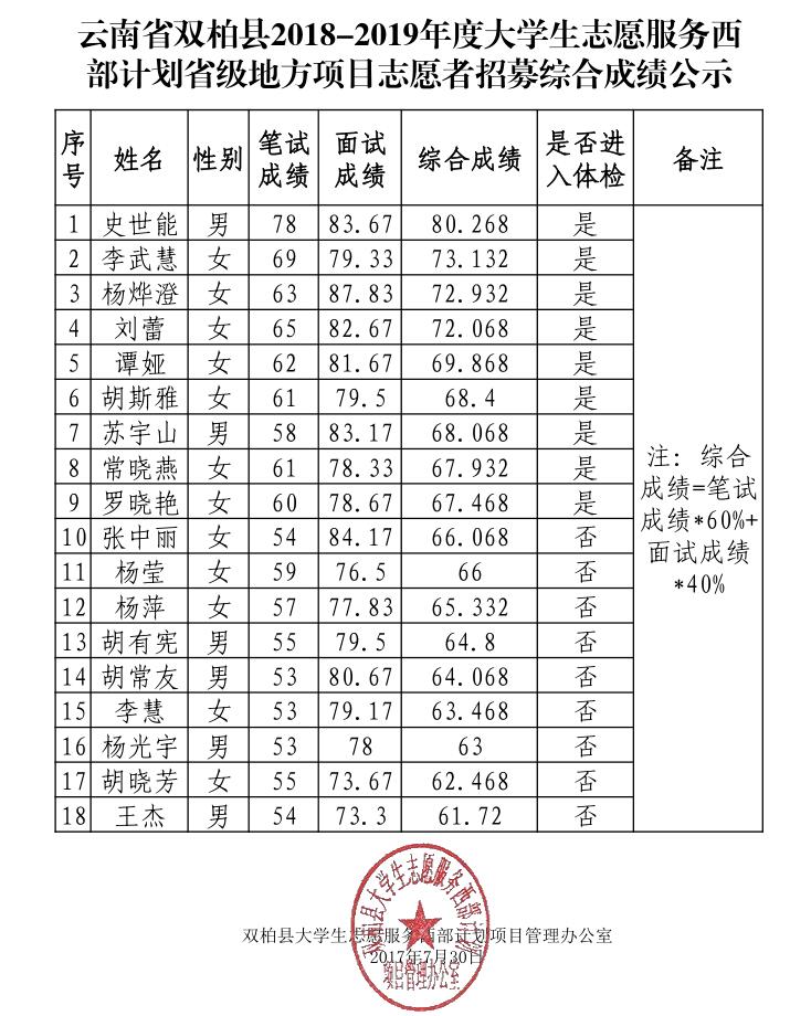 請進入體檢的考生于2018年8月1日8:00攜帶個人有效身份證件及一寸近期免冠證件照前往雙柏縣人民醫(yī)院住院部前集中,由項目辦工作人員組織統(tǒng)一體檢。體檢前請勿進食飲水,自備體檢費用259.00元。若存在體檢不合格或近期有在崗志愿者離崗的情況,項目辦將根據(jù)實際情況進行補錄。現(xiàn)將綜合成績排名及進入體檢人員名單公示如下,公示有效期為三天(2018年7月30日-2018年8月1日),如有異議,請向雙柏縣大學(xué)生志愿服務(wù)西部計劃項目管理辦公室(雙柏團縣委辦公室)反映。