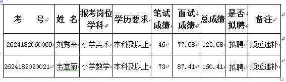 2018年7月30日至31日,通過對擬聘人員進行體檢,小學美術(本科崗位)和小學數學(本科崗位)需順延遞補,現將遞補相關事項公告如下:
