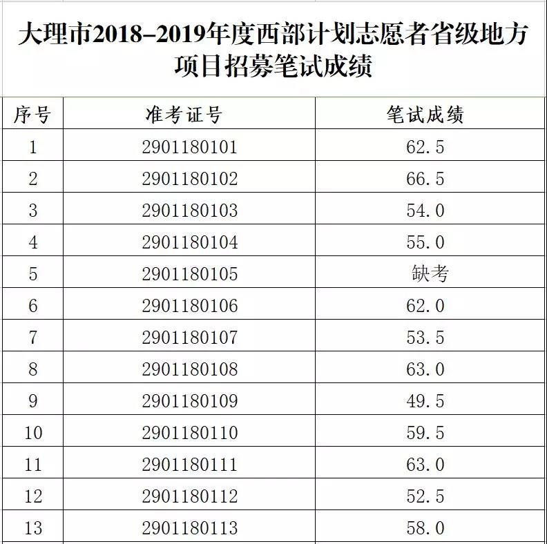 大理市2018—2019年度大學(xué)生志愿服務(wù)西部計(jì)劃省級(jí)地方項(xiàng)目志愿者招募筆試環(huán)節(jié)已結(jié)束。本次招募自7月24日發(fā)布公告以來(lái),共72人報(bào)名,全部資格審查合格。8月4日上午9:00-11:00在下關(guān)四小舉行筆試,應(yīng)考72人,實(shí)考65人,缺考7人。根據(jù)《大理州2018-2019年度西部計(jì)劃志愿者省級(jí)地方項(xiàng)目招募工作實(shí)施方案》的規(guī)定,現(xiàn)將考生筆試成績(jī)公布如下: