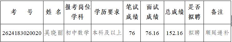 2018年8月20日初中數(shù)學崗位有1位考生放棄擬聘資格,根據(jù)《麻栗坡縣2018年特崗教師招聘公告》“若體檢后出現(xiàn)缺額的,可按總成績依次遞補”規(guī)定,現(xiàn)將順延遞補相關(guān)事項公告如下: