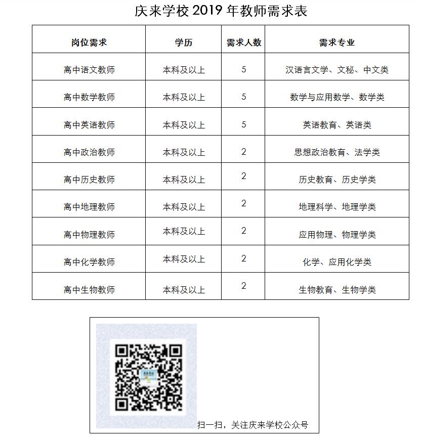 真誠地期待熱愛教育事業(yè)的您加入我們!更多信息請登陸慶來學(xué)校網(wǎng)站: