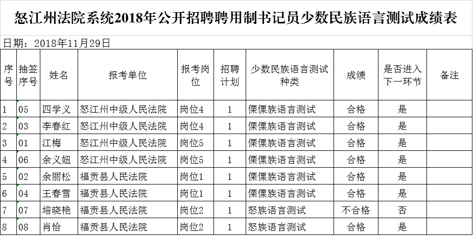 怒江州法院系統(tǒng)2018年招聘聘任制書記員少數(shù)民族語言測試結(jié)果公告