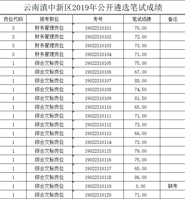 云南滇中新區(qū)2019年公開遴選筆試成績