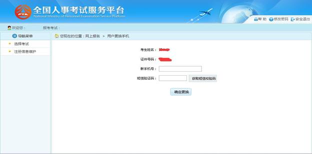 在該頁(yè)面可以完成對(duì)密碼找回及答案信息進(jìn)行修改,也可更換綁定的手機(jī)號(hào)。點(diǎn)擊“更換手機(jī)”按鈕,跳轉(zhuǎn)到更換手機(jī)頁(yè)面,通過(guò)該頁(yè)面可以完成綁定手機(jī)號(hào)的更換操作。