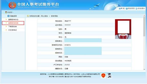 考生可以通過(guò)點(diǎn)擊“查看報(bào)考信息”按鈕,查看考生填寫(xiě)的報(bào)考信息,如下圖所示: