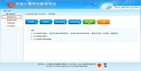 通過(guò)審核的考生可以進(jìn)行網(wǎng)上繳費(fèi),點(diǎn)擊報(bào)考流程中“網(wǎng)上繳費(fèi)”選項(xiàng),可以進(jìn)入網(wǎng) 上繳費(fèi)的頁(yè)面,如下圖所示: