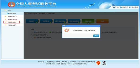 點(diǎn)擊系統(tǒng)導(dǎo)航菜單的“下載報(bào)名表”選項(xiàng),可以下載考生信息表;下載考生信息表操 作必須在考生完成繳費(fèi)之后才能進(jìn)行,如果考生未完成繳費(fèi)點(diǎn)擊“下載報(bào)名表”菜單,系 統(tǒng)會(huì)提示“您未完成繳費(fèi),不能下載報(bào)名表”。如下圖所示: