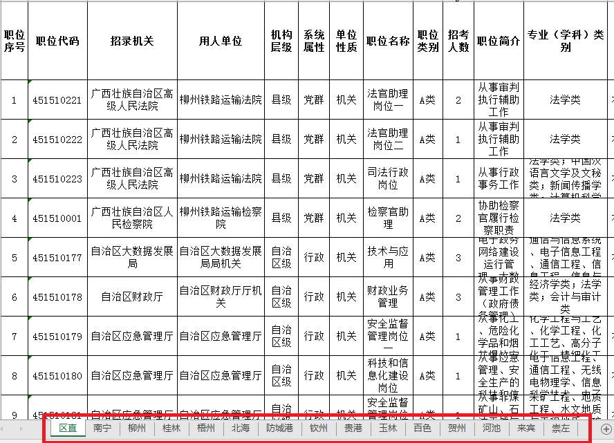 官網(wǎng)下載來源“廣西人事考試網(wǎng)”,下載之后得到“.xlsx”的文件,該文件使用的是MS—office辦公軟件的Excel制作,請確保你的電腦或手機已經(jīng)安裝MS—office辦公軟件,否則打開的將是亂碼。打開崗位表之后有15張表格,即:區(qū)直、南寧、柳州、桂林、梧州、北海、防城港、欽州、貴港、玉林、百色、賀州、河池、來賓、崇左,請注意各表格之間的切換。如下圖: