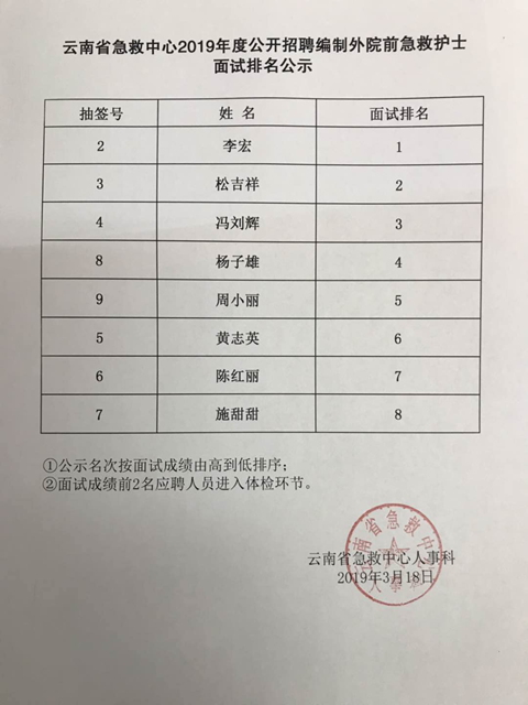 云南省急救中心2019年招聘編制外院前急救護(hù)士面試排名公示