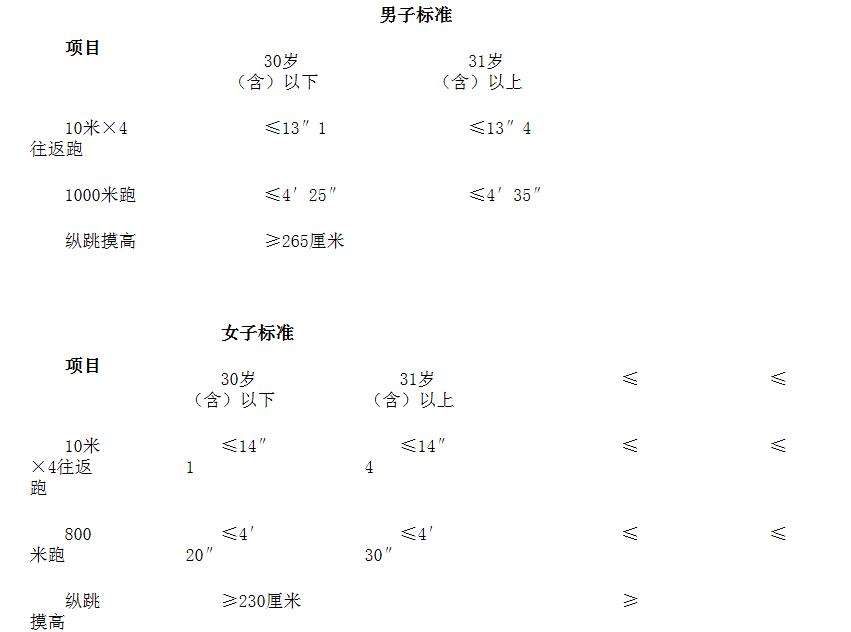 體能測試按照公安部《關(guān)于印發(fā)公安機關(guān)錄用人民警察體能測評項目和標準(暫行)的通知》及其所附標準開展。體能測試的項目如下: