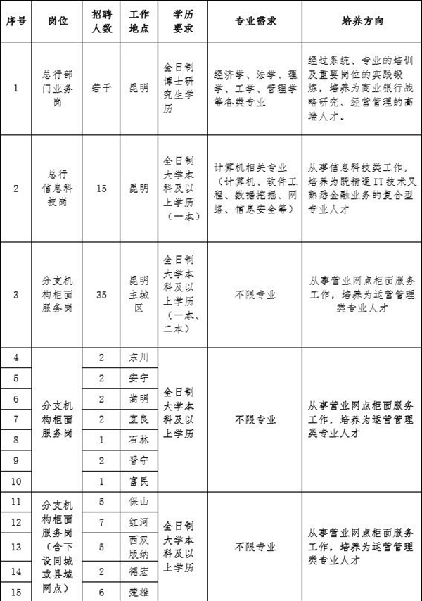 富滇銀行倡導(dǎo)和堅持“以人為本”的人才理念,積極為應(yīng)屆畢業(yè)生提供有競爭力的薪酬、完善的福利、專業(yè)的培訓(xùn)體系、廣闊職業(yè)晉升通道和發(fā)展平臺。根據(jù)業(yè)務(wù)發(fā)展需要,富滇銀行啟動2019年校園招聘,現(xiàn)將有關(guān)事項公告如下: