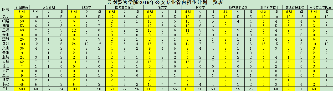 云南警官學(xué)院2019年公安專業(yè)省內(nèi)招生計(jì)劃一覽表