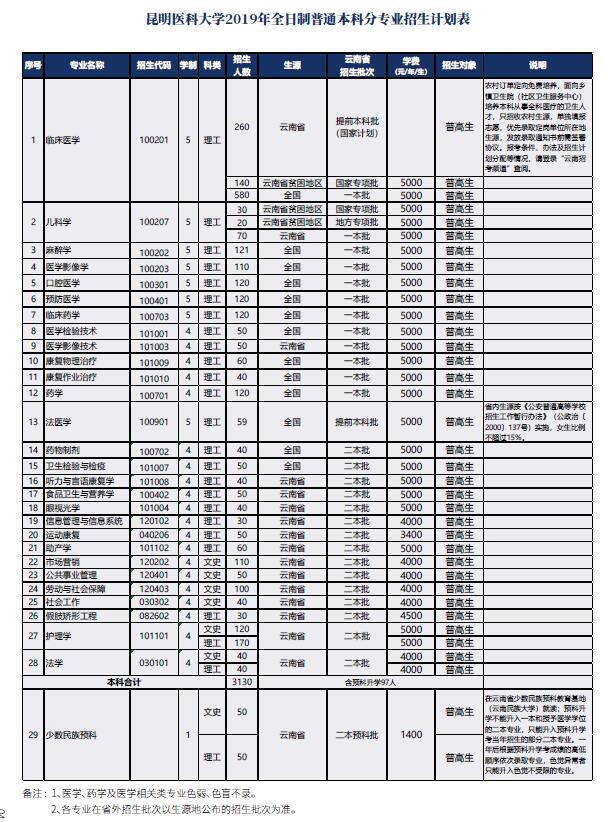 昆明醫(yī)科大學(xué)2019年全日制普通本科分專業(yè)招生計(jì)劃表