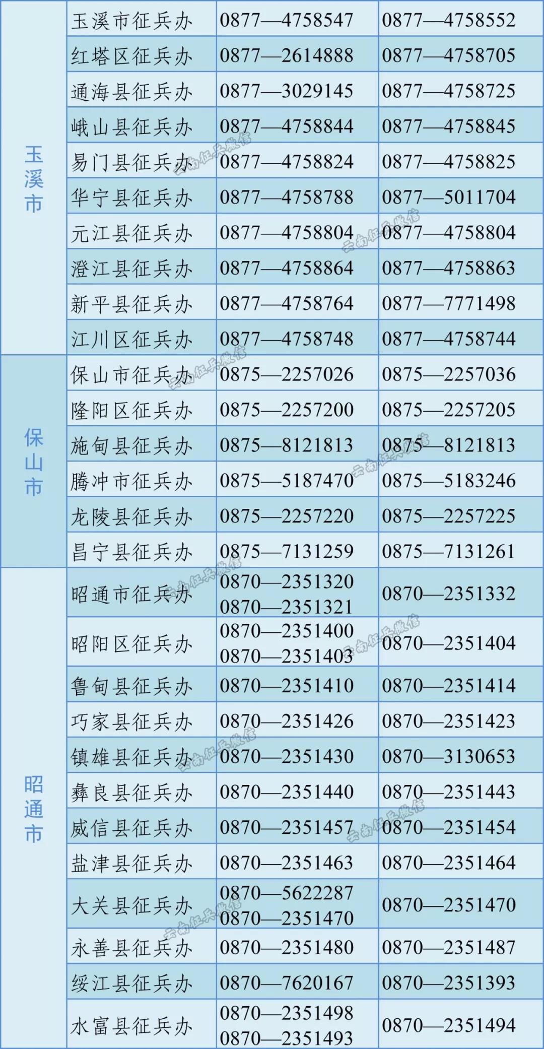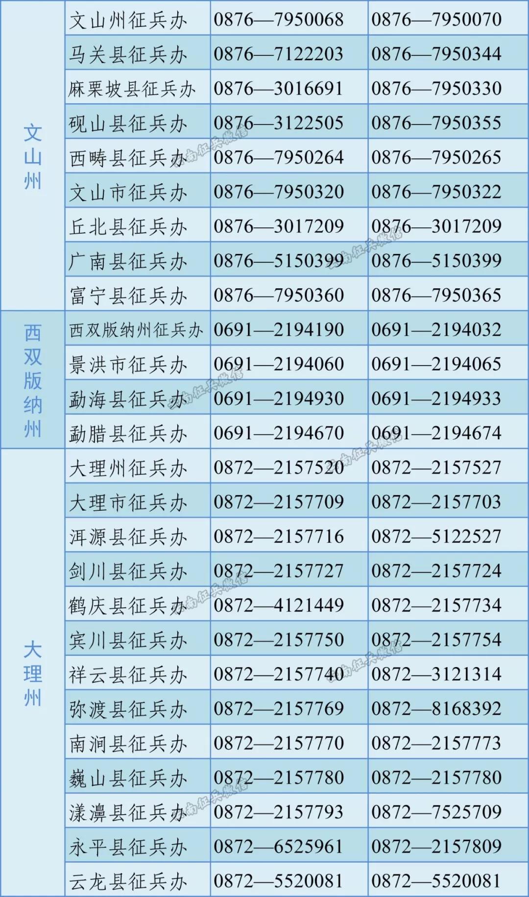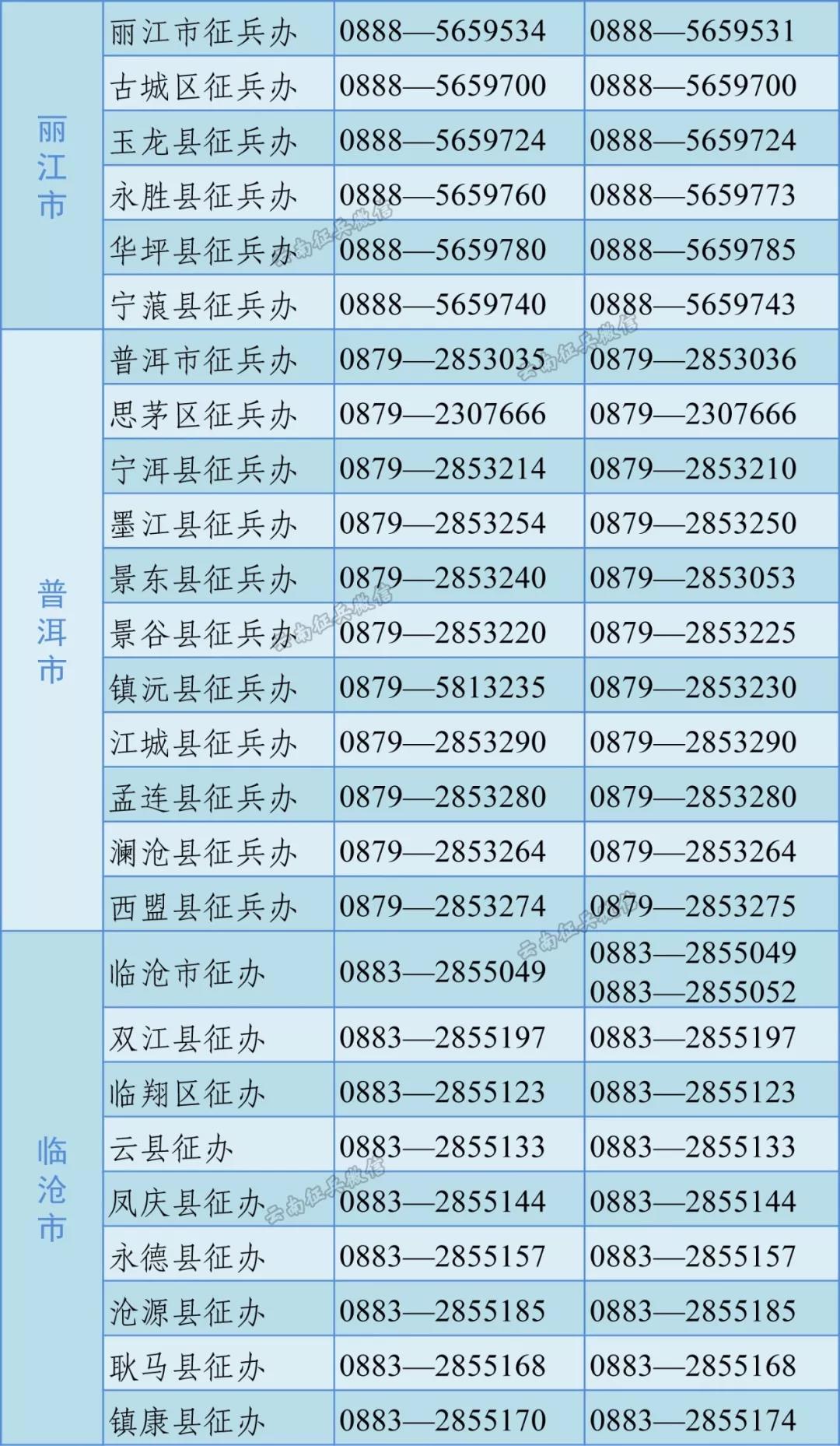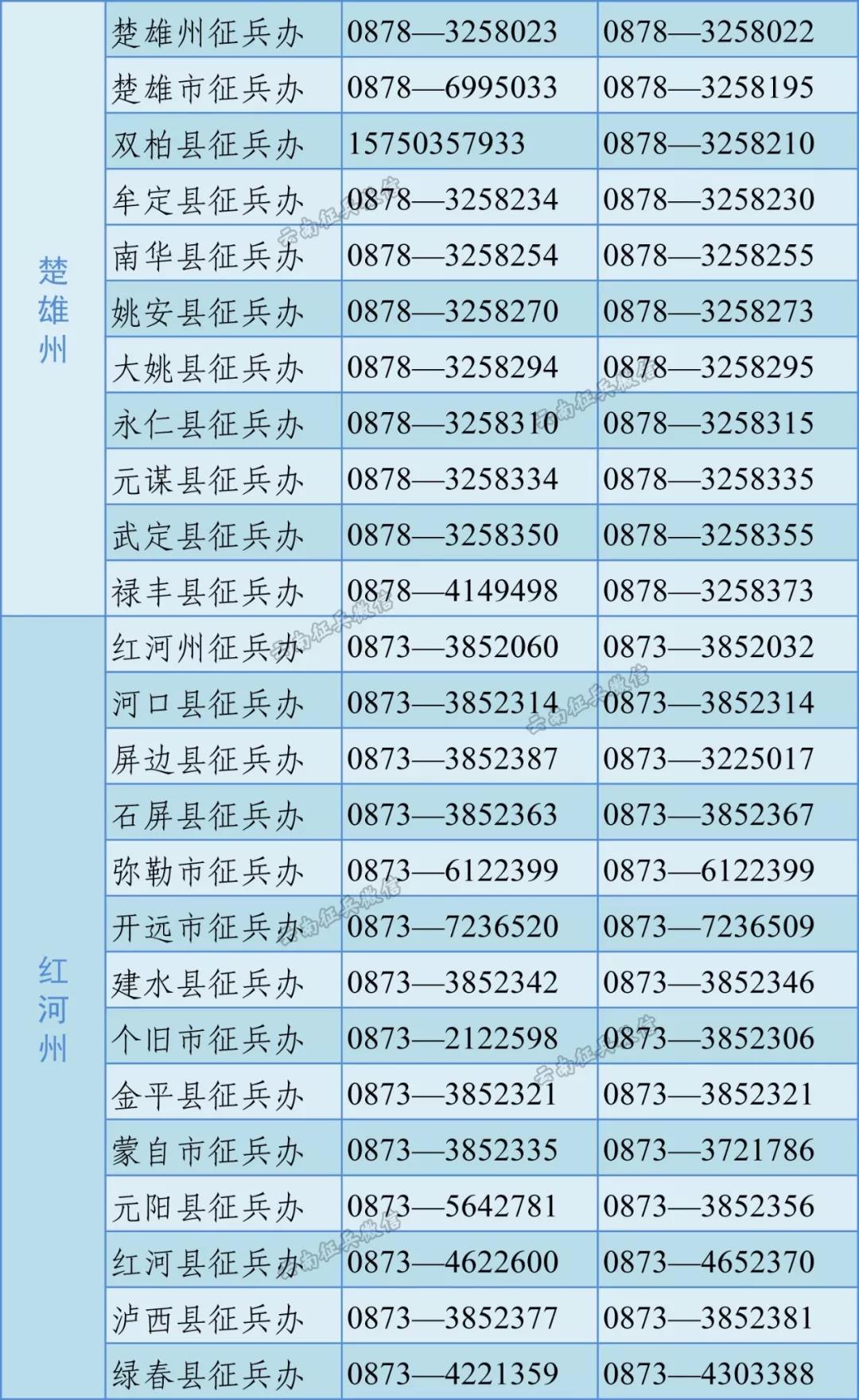 云南省各級(jí)兵役機(jī)關(guān)值班及舉報(bào)電話 為方便適齡青年積極報(bào)名應(yīng)征和咨詢,接受社會(huì)各界對征兵工作的監(jiān)督,現(xiàn)將云南省各級(jí)兵役機(jī)關(guān)值班及舉報(bào)電話公布如下。