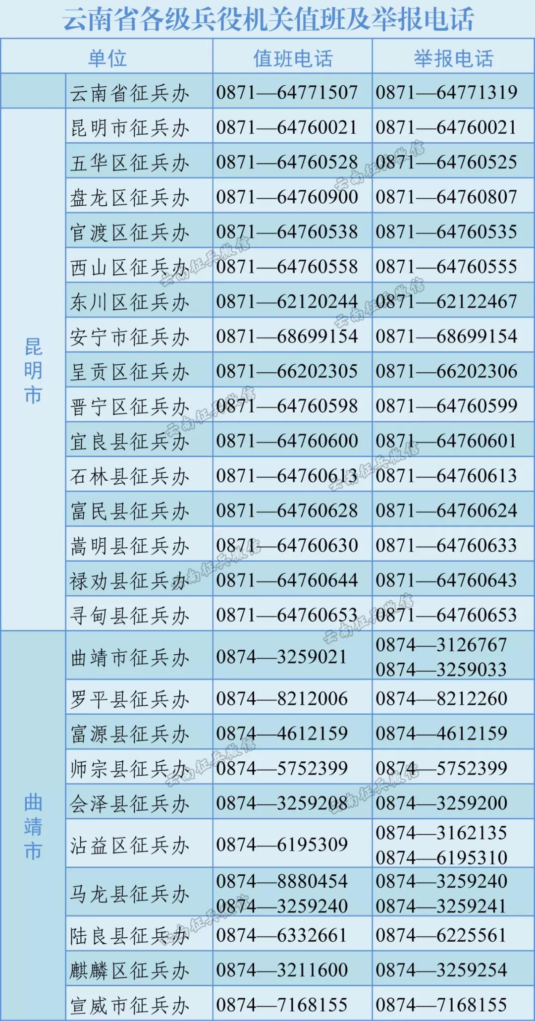 云南省各級(jí)兵役機(jī)關(guān)值班及舉報(bào)電話