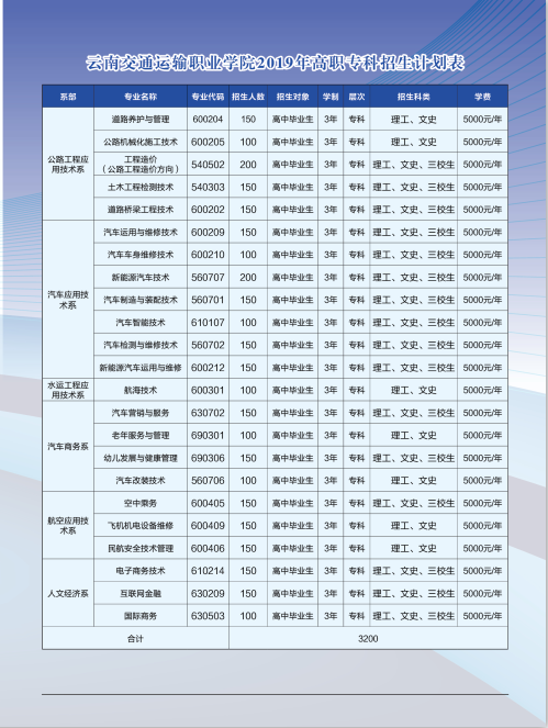云南交通運(yùn)輸職業(yè)學(xué)院2019年招生計(jì)劃