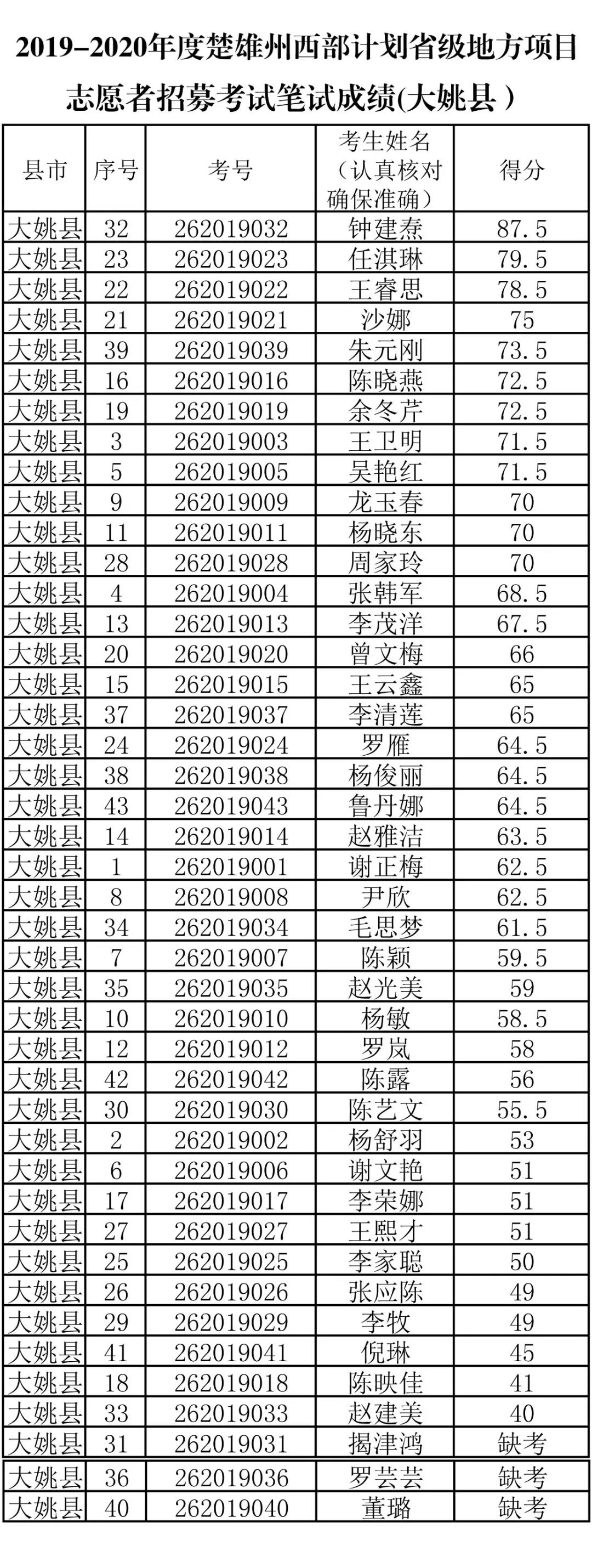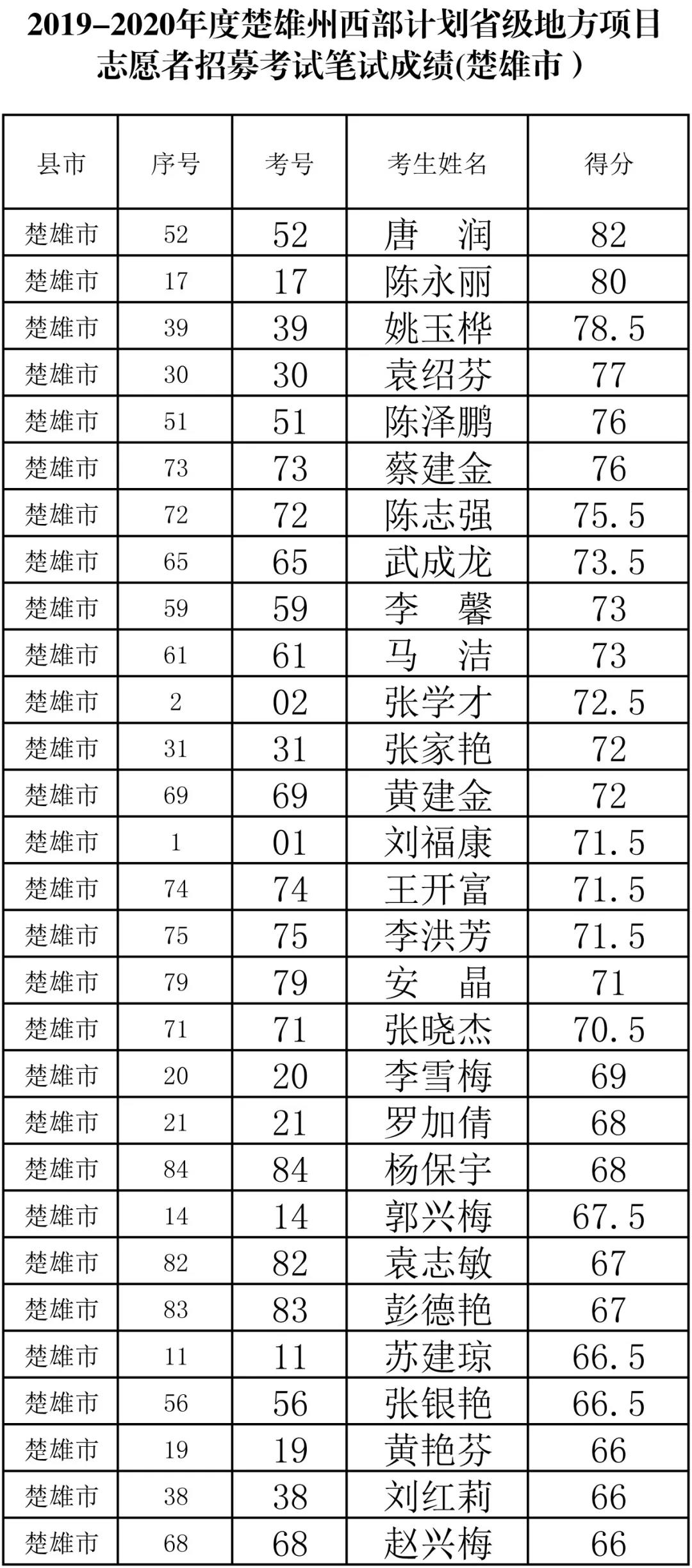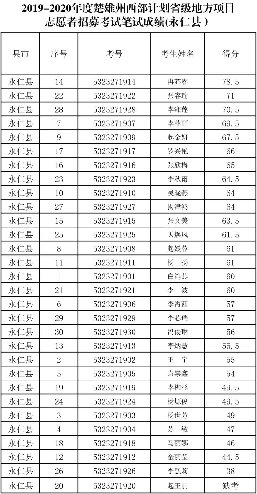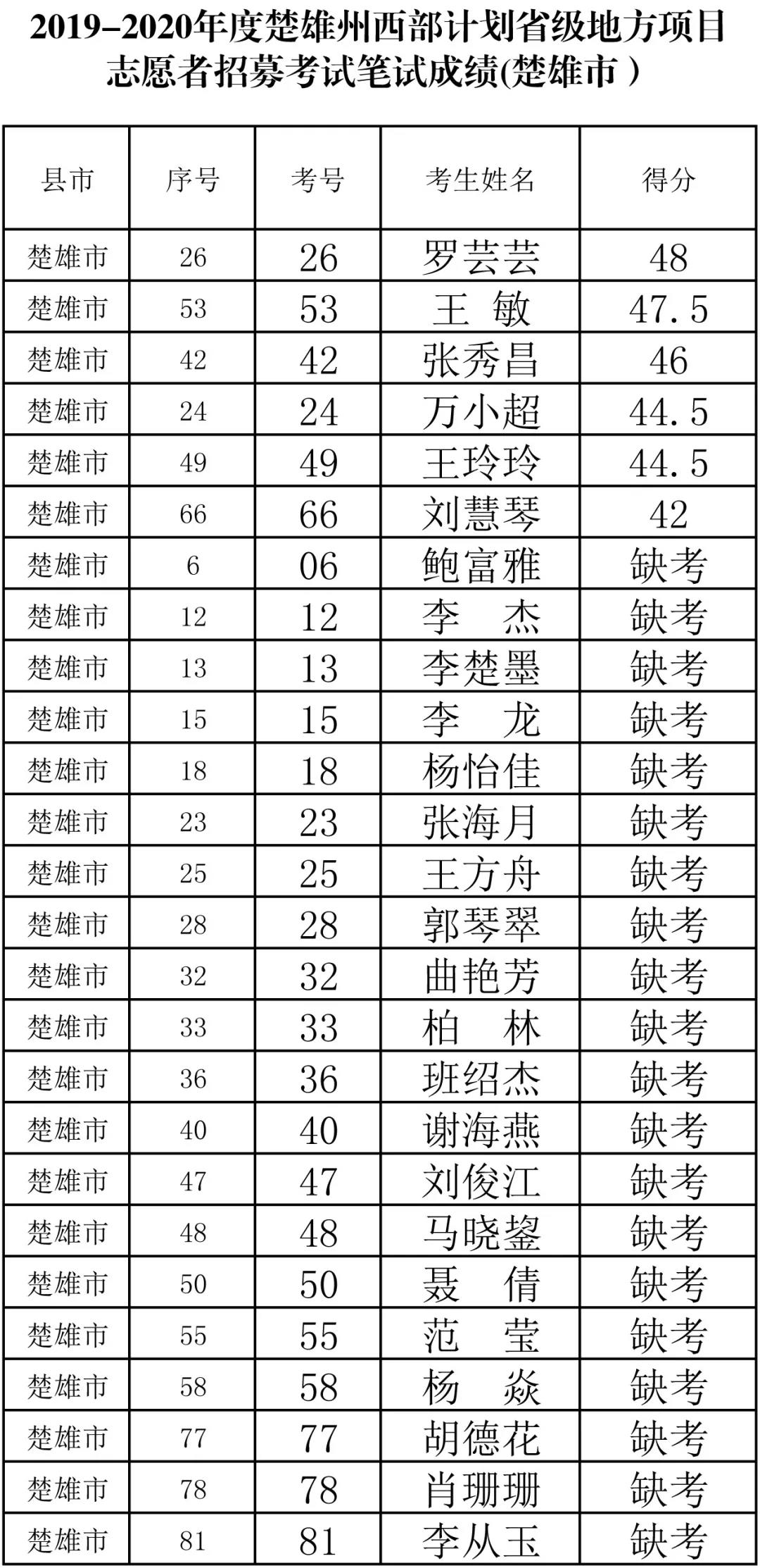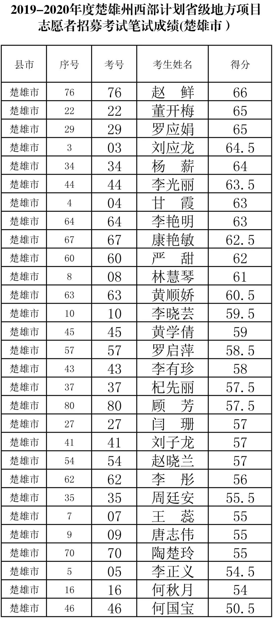 楚雄州2019-2020年度西部計(jì)劃省級(jí)地方項(xiàng)目志愿者筆試成績(jī)公示