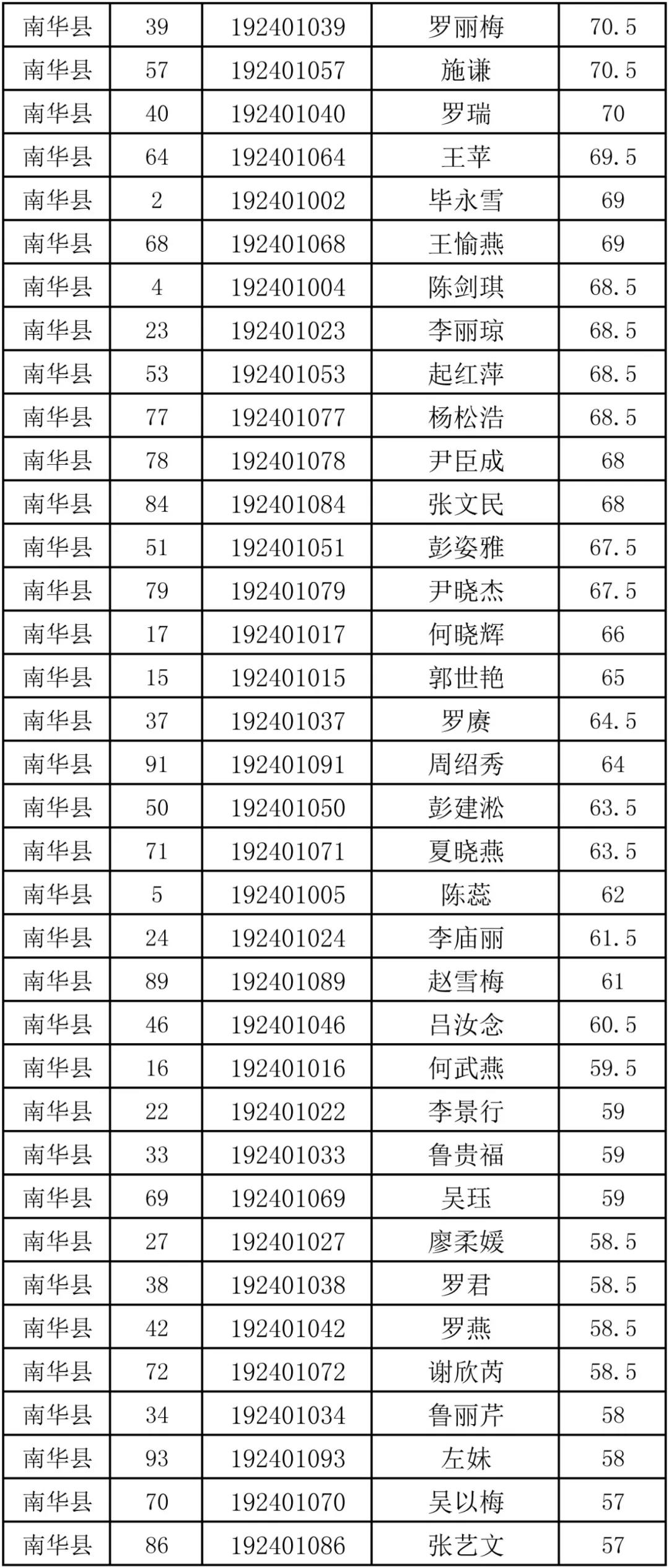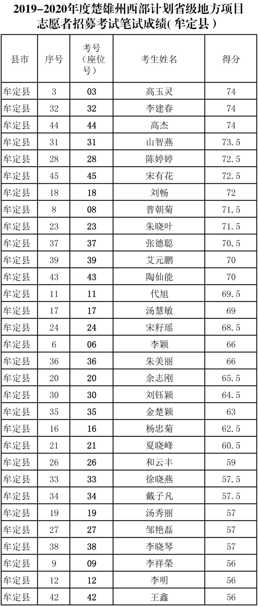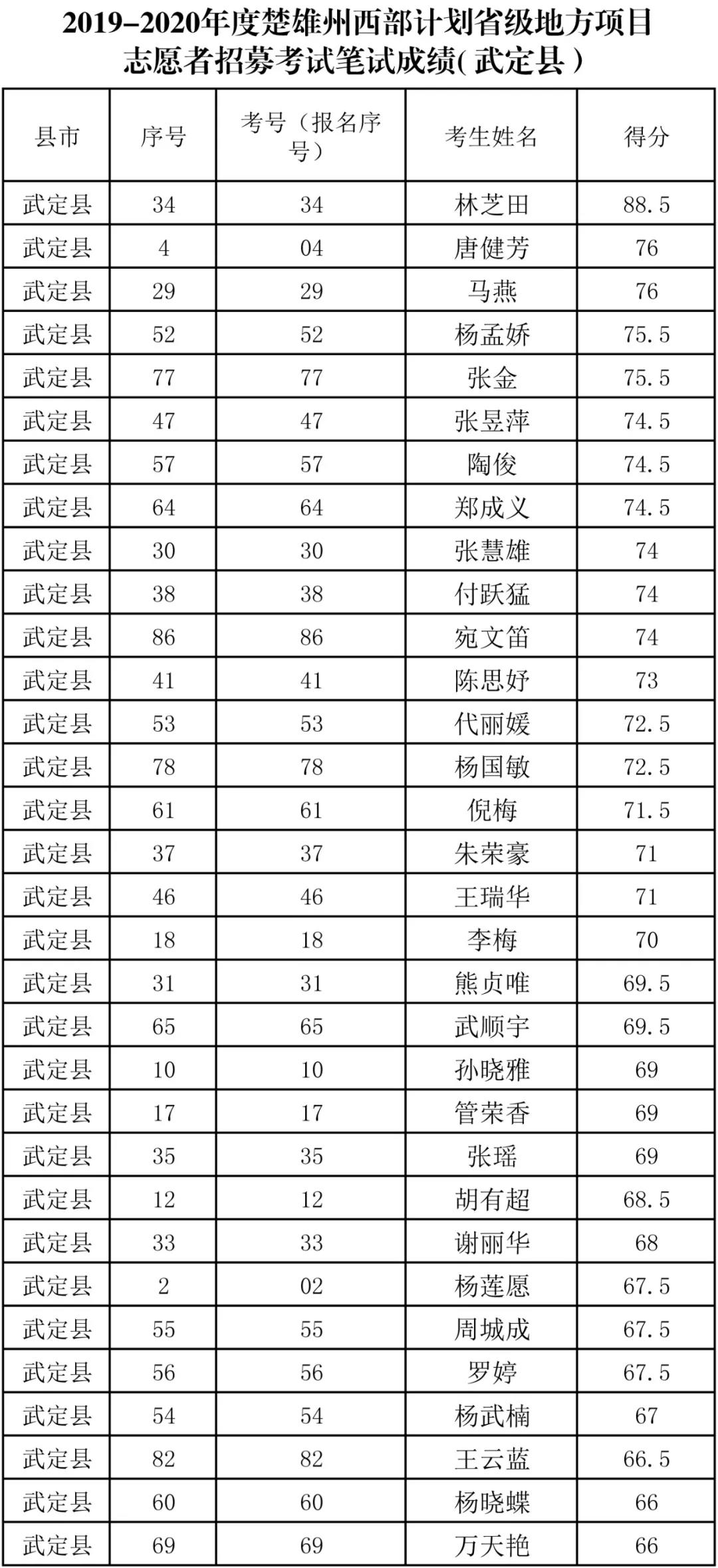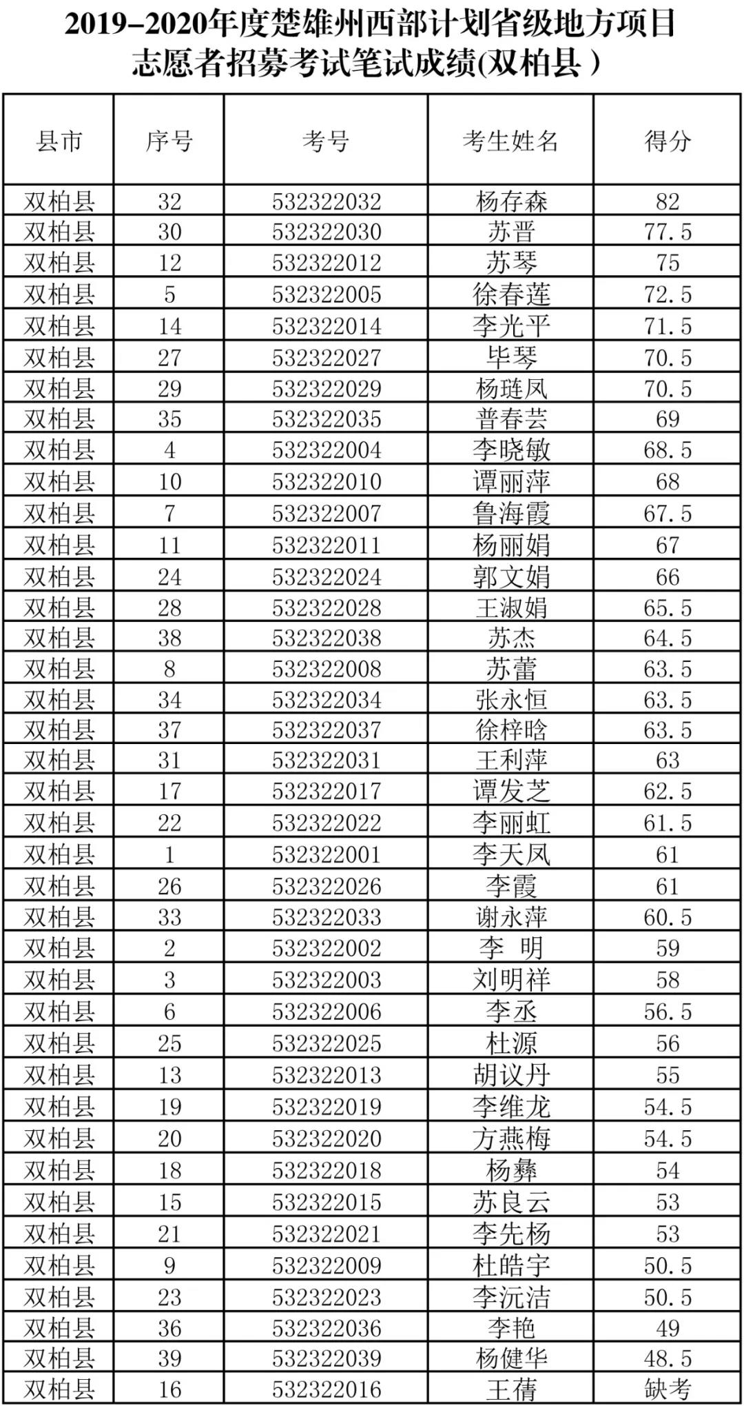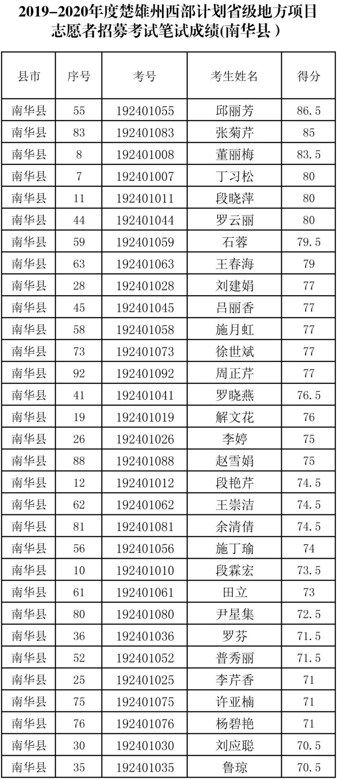 楚雄州2019-2020年度西部計(jì)劃省級(jí)地方項(xiàng)目志愿者筆試成績(jī)公示