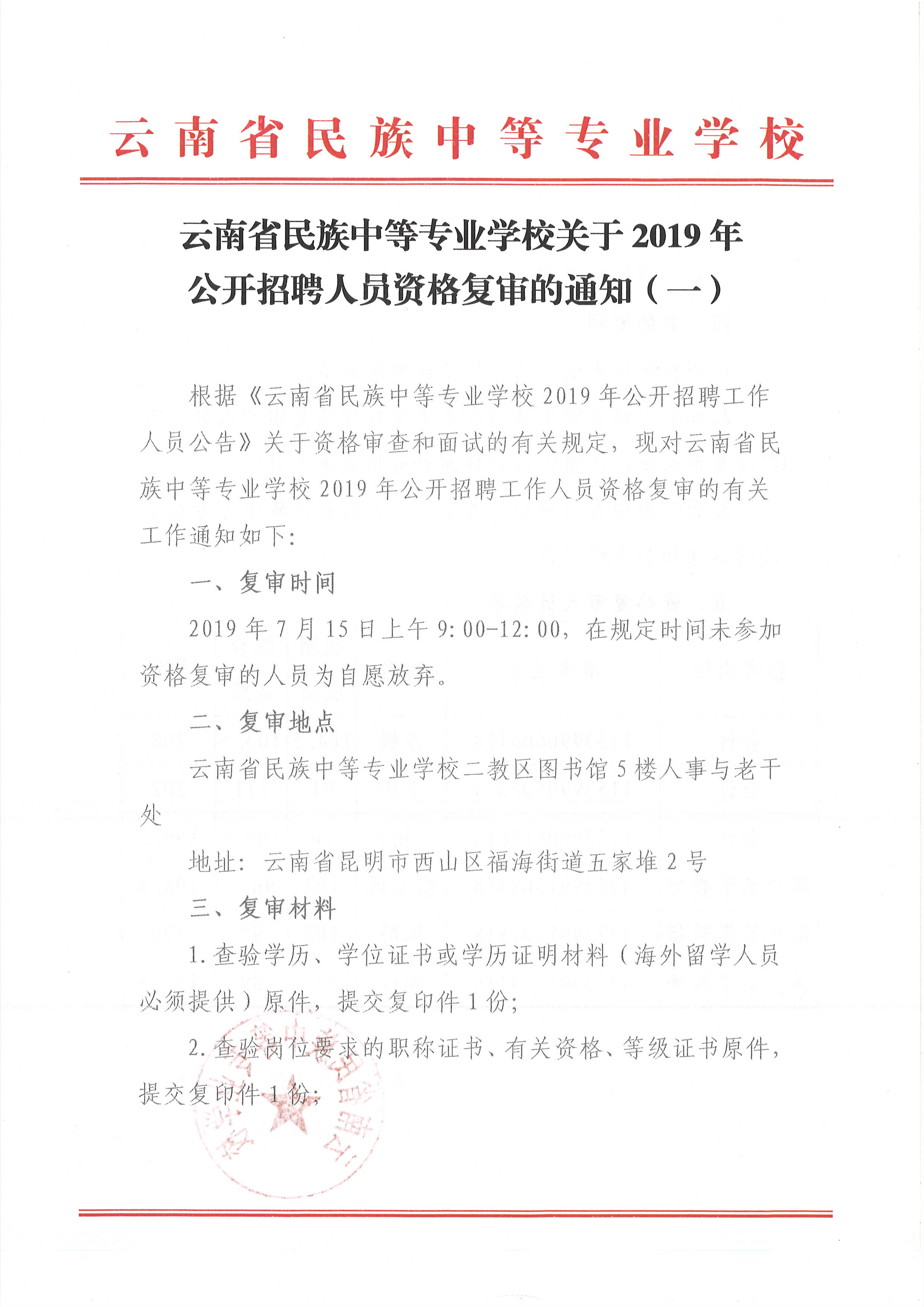 云南省民族中等專業(yè)學(xué)校關(guān)于2019年公開招聘人員資格復(fù)審的通知