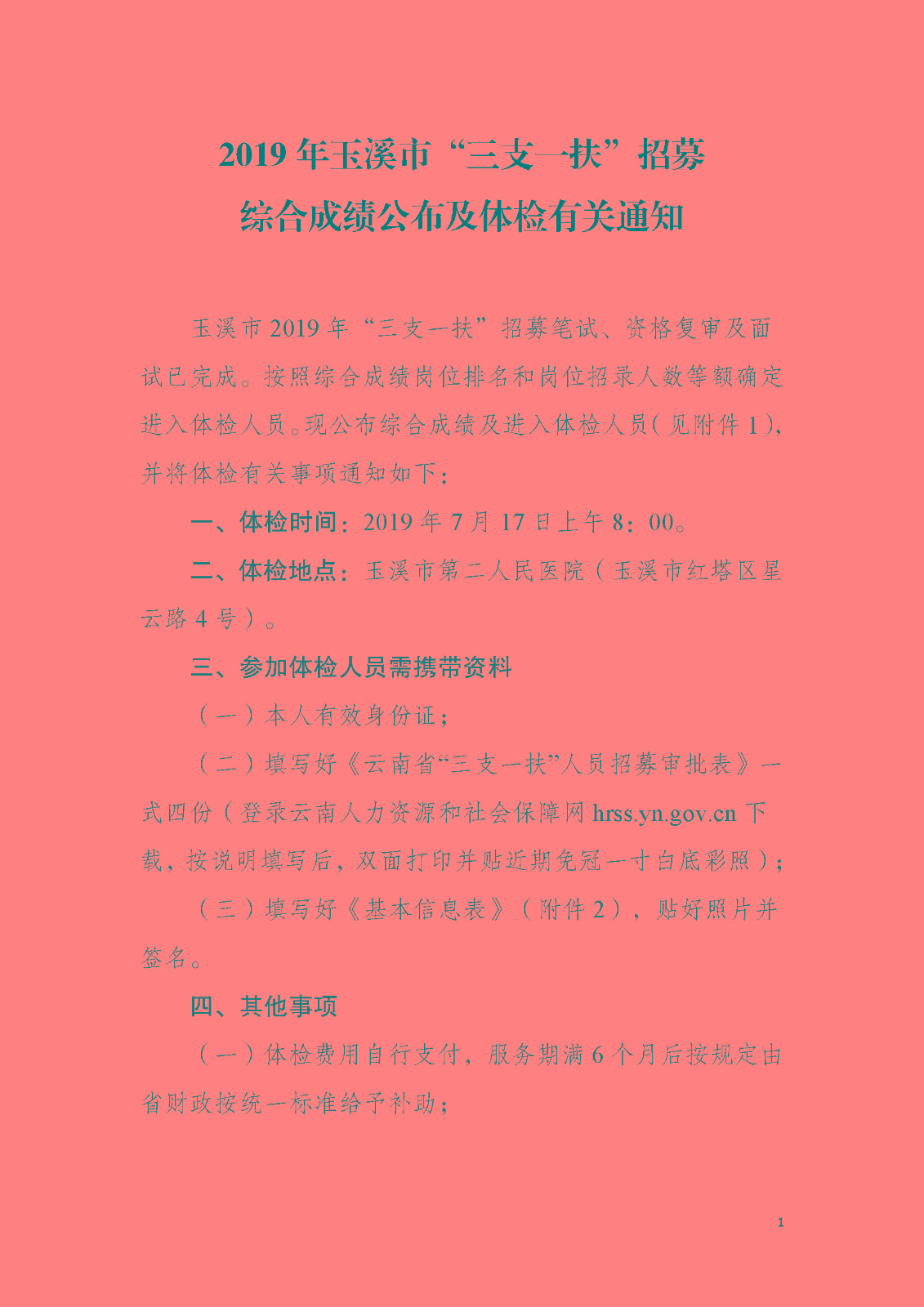 2019年玉溪市“三支一扶”招募綜合成績公布及體檢有關(guān)通知