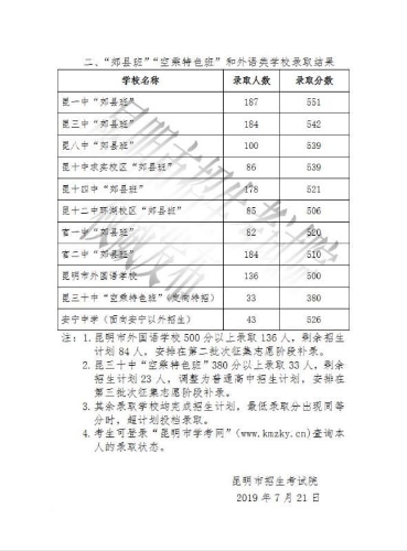 2019年昆明市普通高中錄取公告(提前批次錄取學(xué)校)