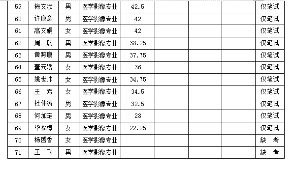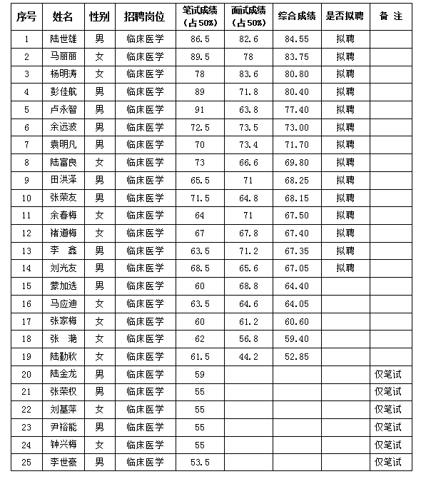 根據(jù)《麻栗坡縣人民醫(yī)院2019年公開招聘編外衛(wèi)生專業(yè)技術(shù)人員公告》,現(xiàn)將考試成績及擬聘人員名單公示如下:
