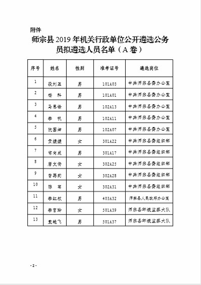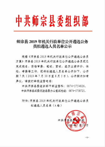 曲靖市師宗縣2019 年遴選公務(wù)員擬遴選名單公示