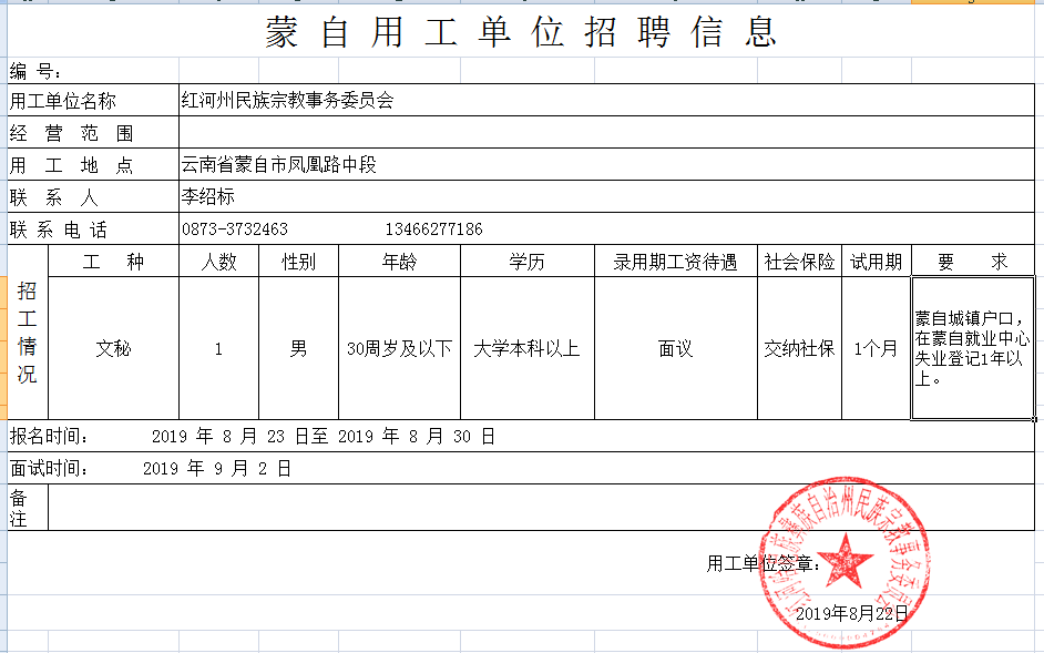 2019年蒙自市紅河州民族宗教事務(wù)委員會(huì)招聘信息