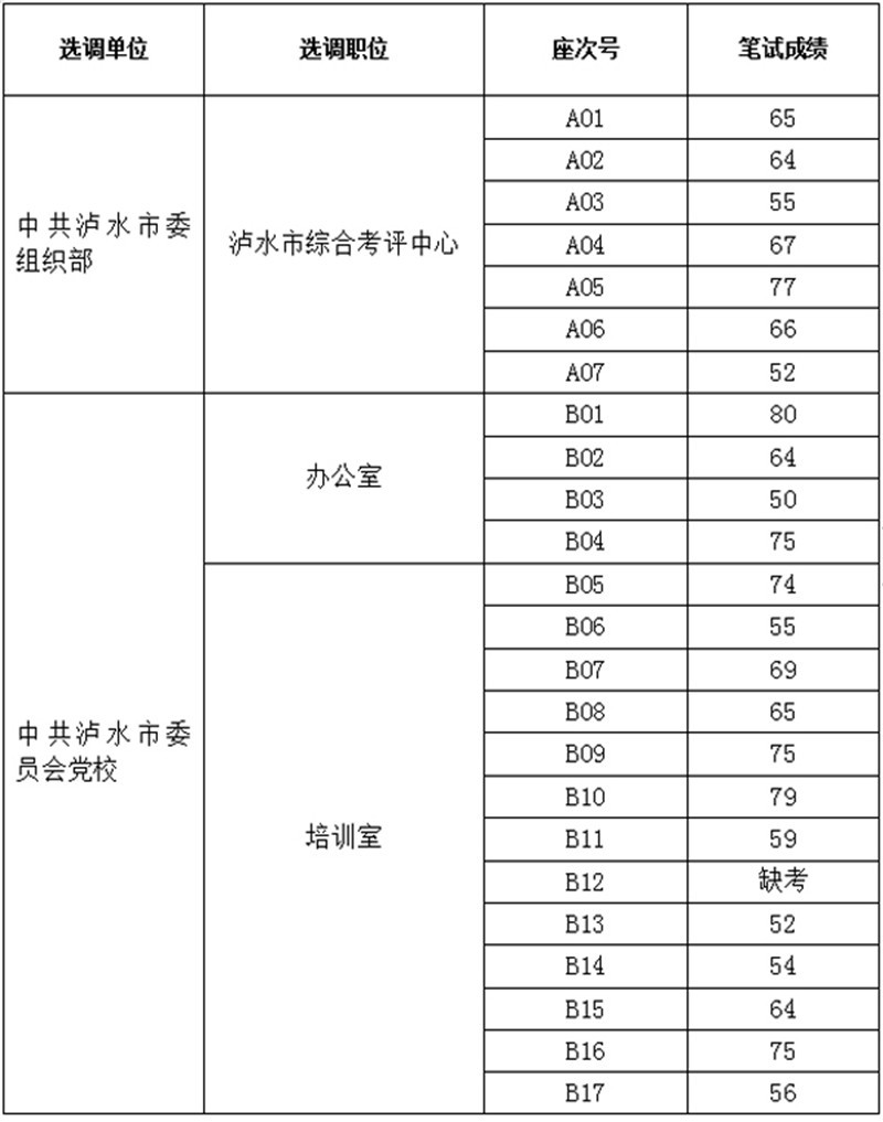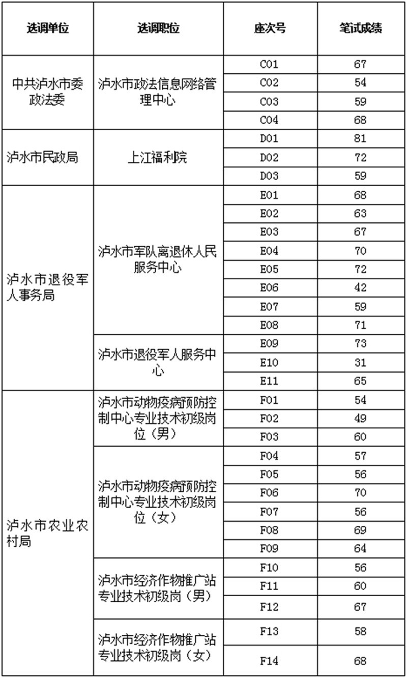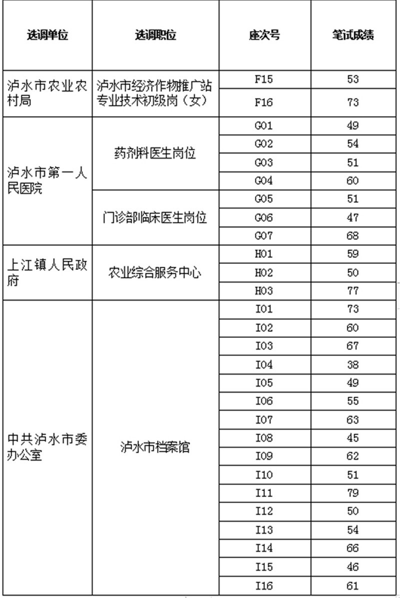 根據(jù)《瀘水市機(jī)關(guān)事業(yè)單位工作人員調(diào)配暫行規(guī)定(試行)》《瀘水市2019年機(jī)關(guān)事業(yè)單位公開選調(diào)工作人員公告》等有關(guān)規(guī)定,現(xiàn)將瀘水市2019年機(jī)關(guān)事業(yè)單位公開選調(diào)工作人員筆試成績公示如下。