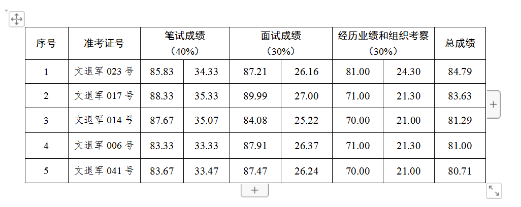 根據(jù)《文山州退役軍人事務(wù)局2019年公開(kāi)遴選公務(wù)員(文秘崗位)公告》規(guī)定,經(jīng)過(guò)筆試、面試、經(jīng)歷業(yè)績(jī)?cè)u(píng)價(jià)和組織考察等環(huán)節(jié),現(xiàn)將成績(jī)予以公布:
